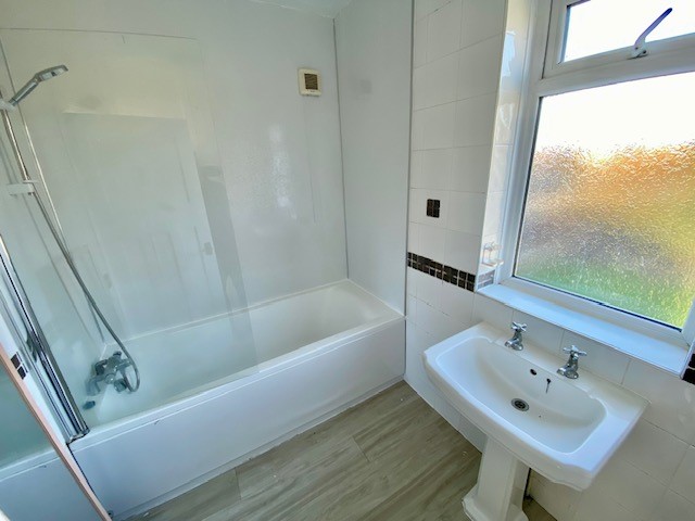 Family Bathroom Bath with electric shower over, wash hand basin, tile walls, upvc double glazed window to rear, linen airing cupboard, radiator.