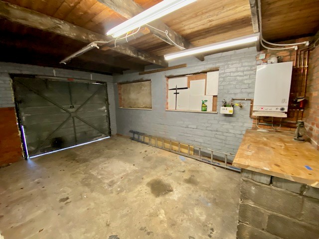 Integral Garage 3.39m x 5.10m Base and eye level storage cupboards and worktop, wall mounted gas fired central heating boiler, up and over garage door.