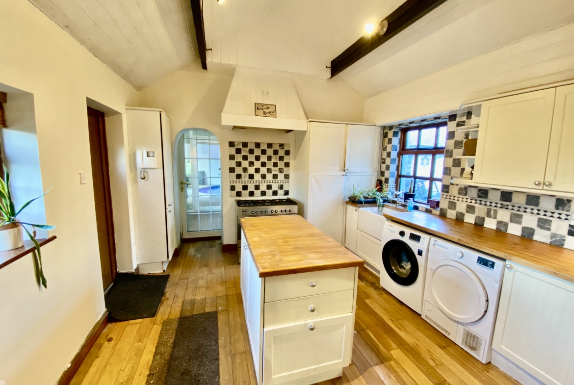 Utility Room 3.59 m x 4.20 m Feature vaulted ceiling. Shaker style base and eye level units. Central island with solid wood worktops incorporating undermount Belfast style ceramic sink with mixer tap. Solid wood flooring. Gas range cooker point with extractor hood over. Larder storage cupboard. Plumbed for washing machine. Stable door entrance door leading to driveway patio.