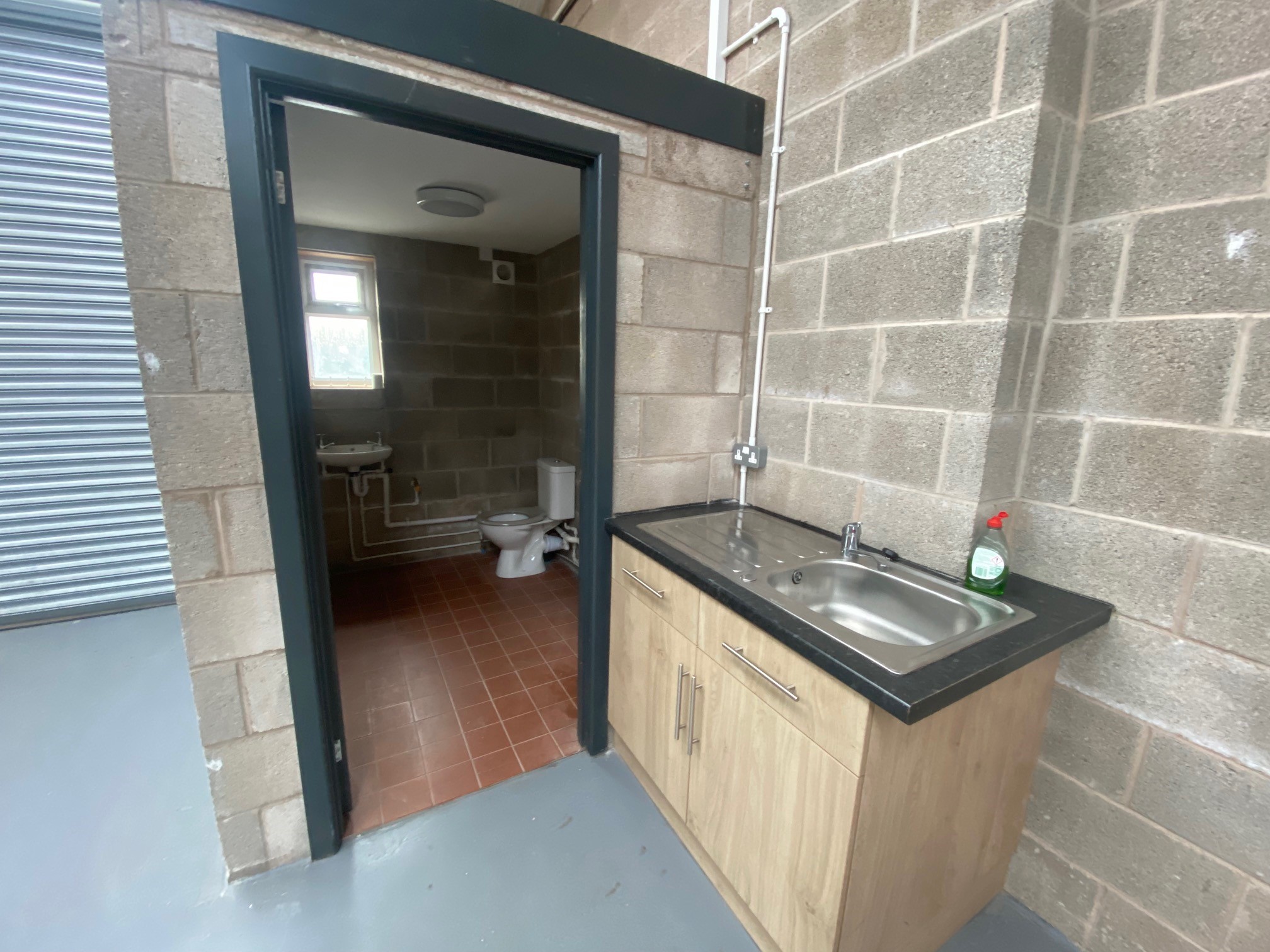 690 sq.ft constructed of concrete block with composite insulated roof cladding plus rooflights. Render front elevation. Internal measurements 9.15m deep x 7m wide. Motorised roller shutter door height 3m x 2.87m wide. Open Plan storage with concrete floor. Power trunking to 5x double wall sockets single phase. Kitchen base unit housing water heater, laminate top with inset single drainer stainless steel sink. Separate disabled WC.